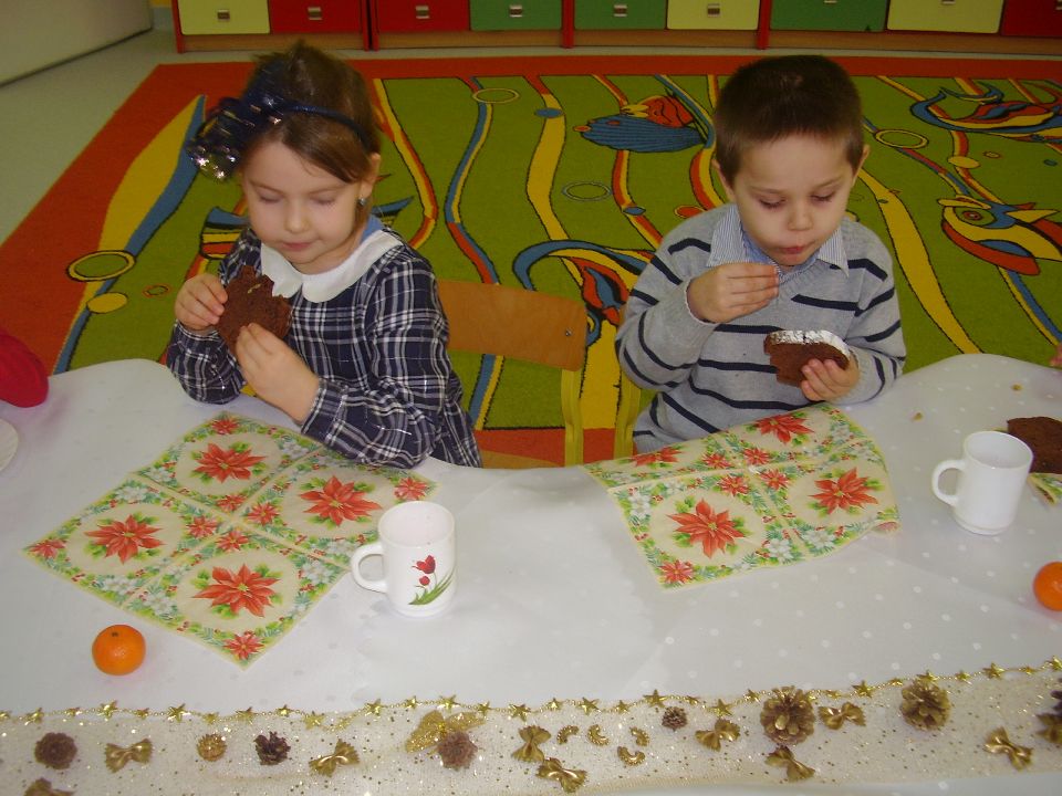 Święta Bożego Narodzenia kryją w sobie niepowtarzalną magię: radość i niecierpliwe oczekiwanie na pierwszą wigilijną gwiazdkę. Dla wielu jest to czas spotkań w rodzinnym gronie, dzielenia się opłatkiem, składania życzeń najbliższym oraz czas wspólnego kolędowania. Także w naszym przedszkolu nastał cudowny dla wszystkich czas – Boże Narodzenie. Wspaniałym momentem było wspólne kolędowanie, dzielenie się opłatkiem i składanie świątecznych życzeń, a także czas wspólnego posiłku, na który składały się tradycyjne wigilijne potrawy. Dzieci smakowały barszczyk, paszteciki z kapustą i grzybami. Na stole nakrytym białym obrusem, ozdobionym świątecznie nie zabrakło także słodkości. Takie podniosłe chwile nie tylko utrwalają dzieciom znajomość tradycji i zwyczajów świątecznych lecz również, co najważniejsze, wzmacniają bliskie i serdeczne relacje.
