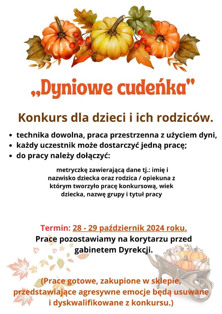 30 października będziemy obchodzić w Dzień Dyni. Prosimy o ubranie swoich pociech na pomarańczowo lub w stroje przedstawiające dynie. W przedszkolu odbywać się będą gry i zabawy a także konkurs na najpiękniejszą dynię. Planujemy także magiczną niespodziankę, z tego względu prosimy o wpłaty po 10 zł u wychowawców grup.