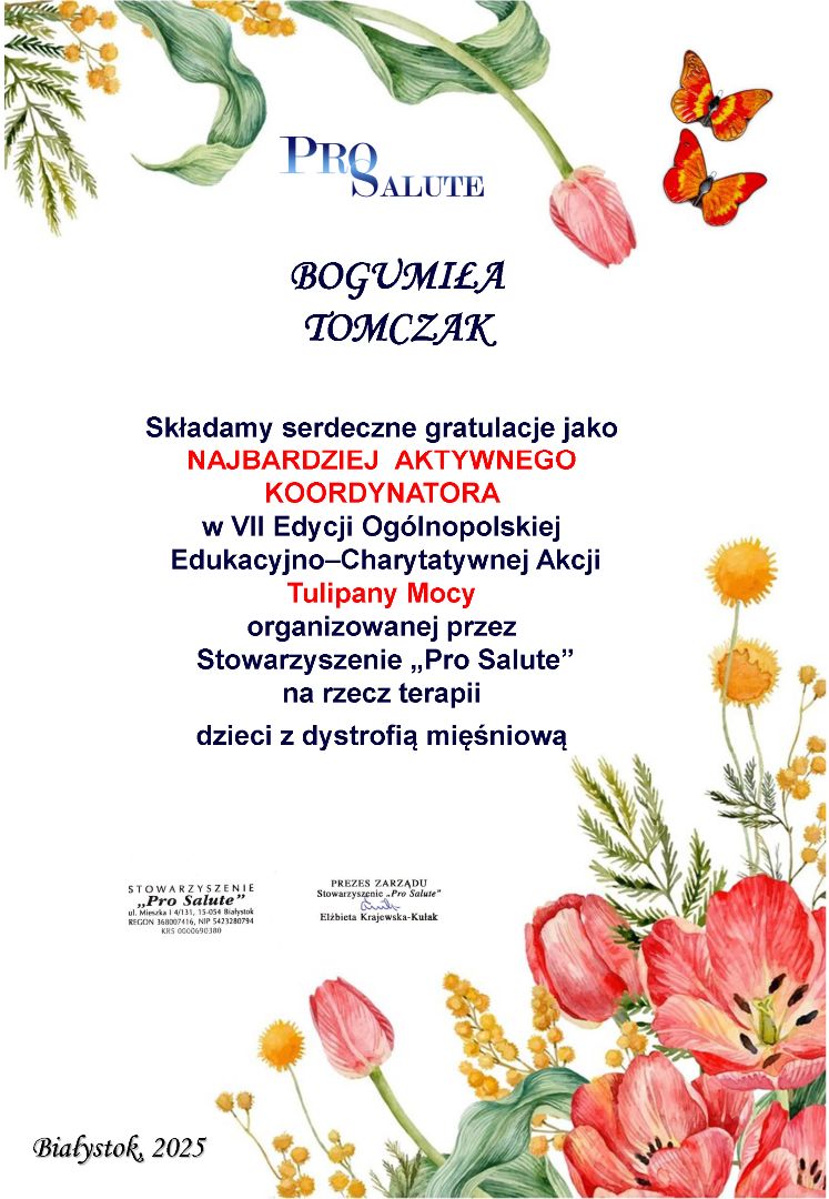 Przedszkole Samorządowe nr 79 „Konwaliowy Zakątek” w Białymstoku z radością informuje, że zostaliśmy nagrodzeni w VI edycji ogólnopolskiej edukacyjno-charytatywnej akcji „Tulipany Mocy” na rzecz dzieci z dystrofią mięśniową Duchenne’a.