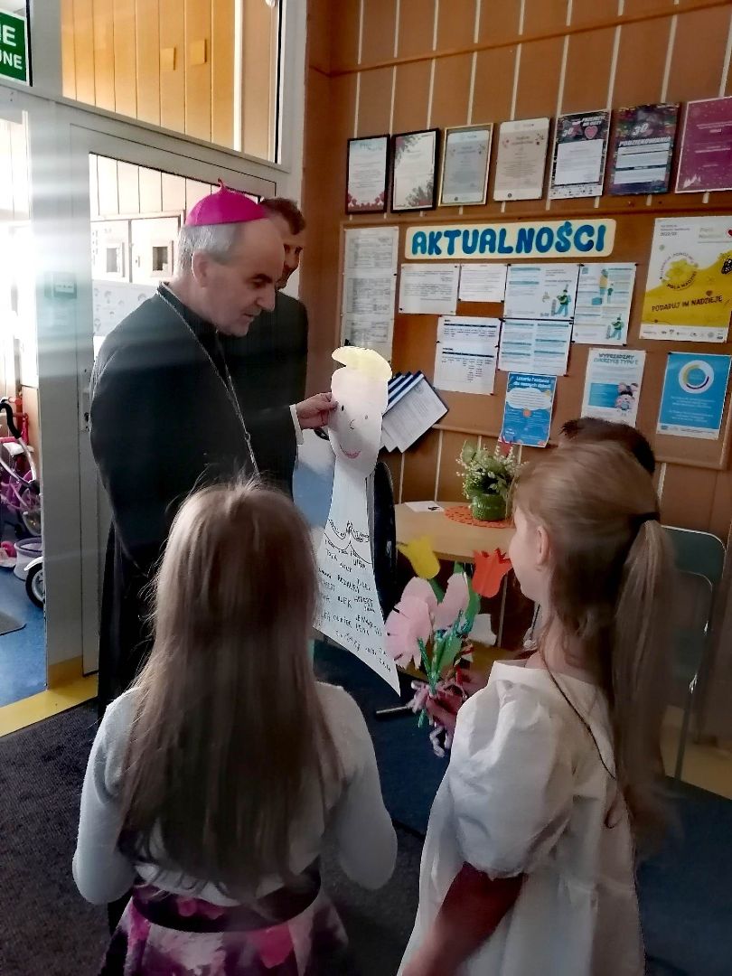 Wczoraj nasze przedszkole odwiedził Jego Ekscelencja Ksiądz Biskup Henryk Ciereszko. Wizyta odbyła się w ramach wizytacji kanonicznej Parafii pw. NMP z Guadalupe. W spotkaniu uczestniczyli również: Ksiądz Maciej Kozłowski - proboszcz parafii oraz Ksiądz Grzegorz Bolesta-wikariusz tejże parafii prowadzący zajęcia religii w naszym przedszkolu. W imieniu całej społeczności przedszkolnej - dzieci, nauczycieli, pracowników, Księdza Biskupa powitała Dyrektor Przedszkola- Pani Grażyna Danielczyk, a delegacja przedszkolaków powitała przybyłych gości pięknym wierszem oraz własnoręcznie wykonanymi kwiatkami i aniołami. Następnie mili goście w towarzystwie Pani Dyrektor, przedstawicieli grona pedagogicznego i dzieci odwiedzili wszystkie grupy przedszkolne i rozmawiali z naszymi przedszkolakami, a starsze grupy zaprezentowały szanownym gościom piosenki. Cieszymy się, że mogliśmy gościć Jego Ekscelencję w murach naszego przedszkola, takie spotkanie jest niewątpliwie chwilą refleksji nad tym, co dobre i wartościowe.